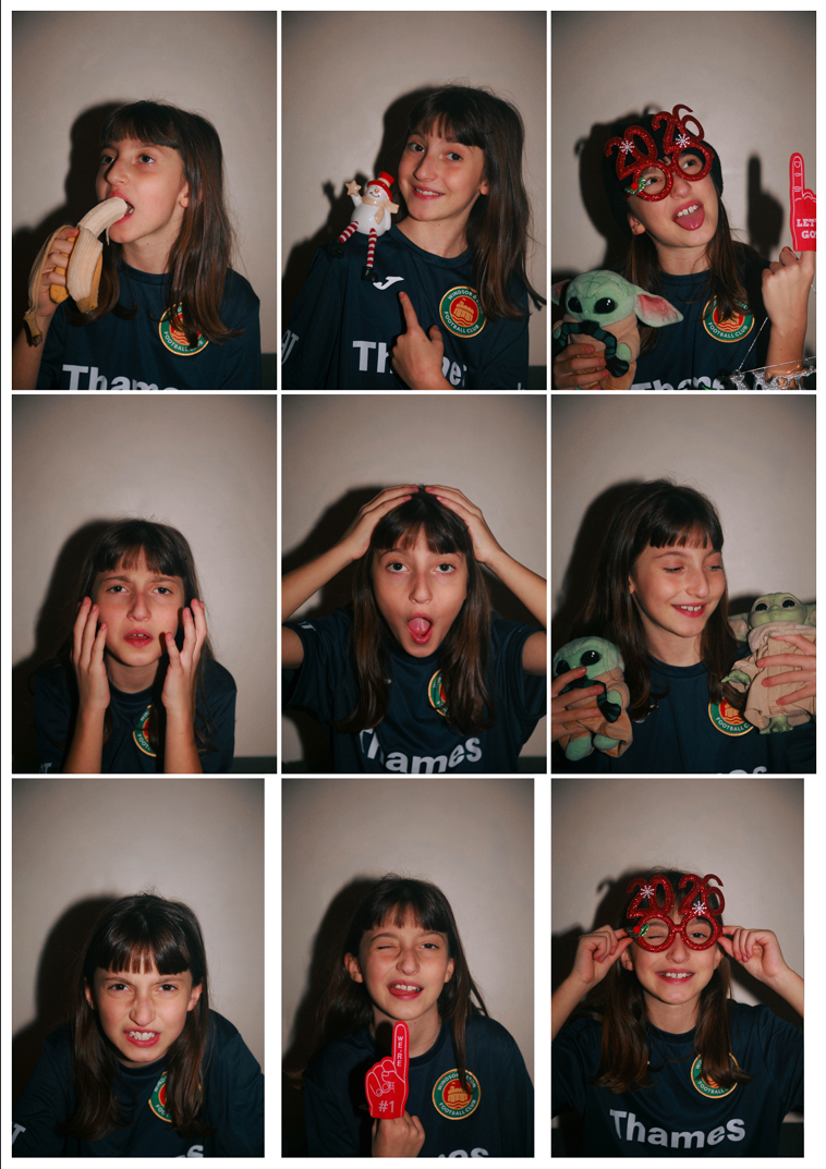 I used my living room, a flash and some accessories to direct my sibling and produced a set of images that mimic a photobooth contact sheet.